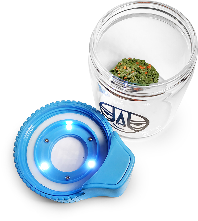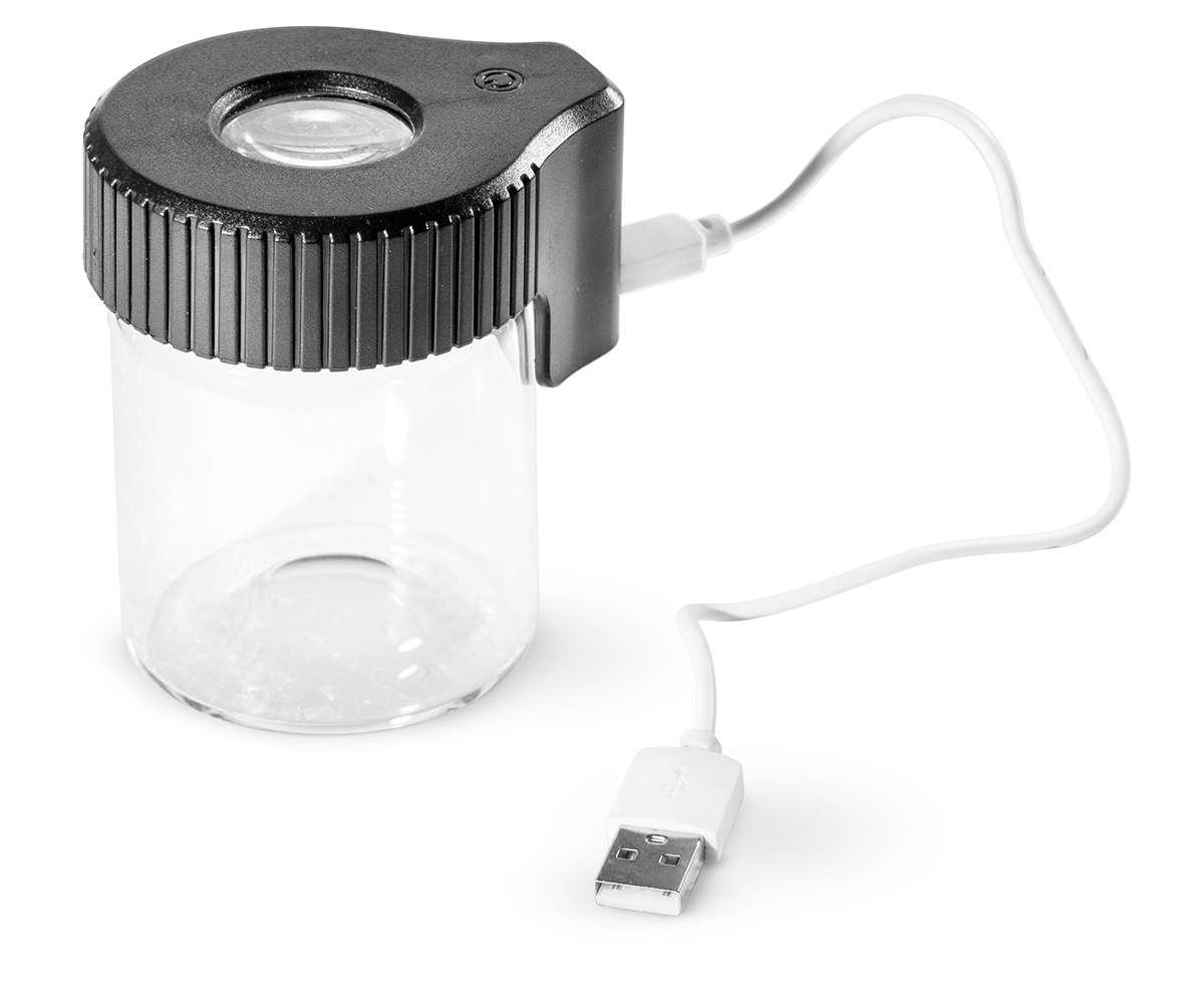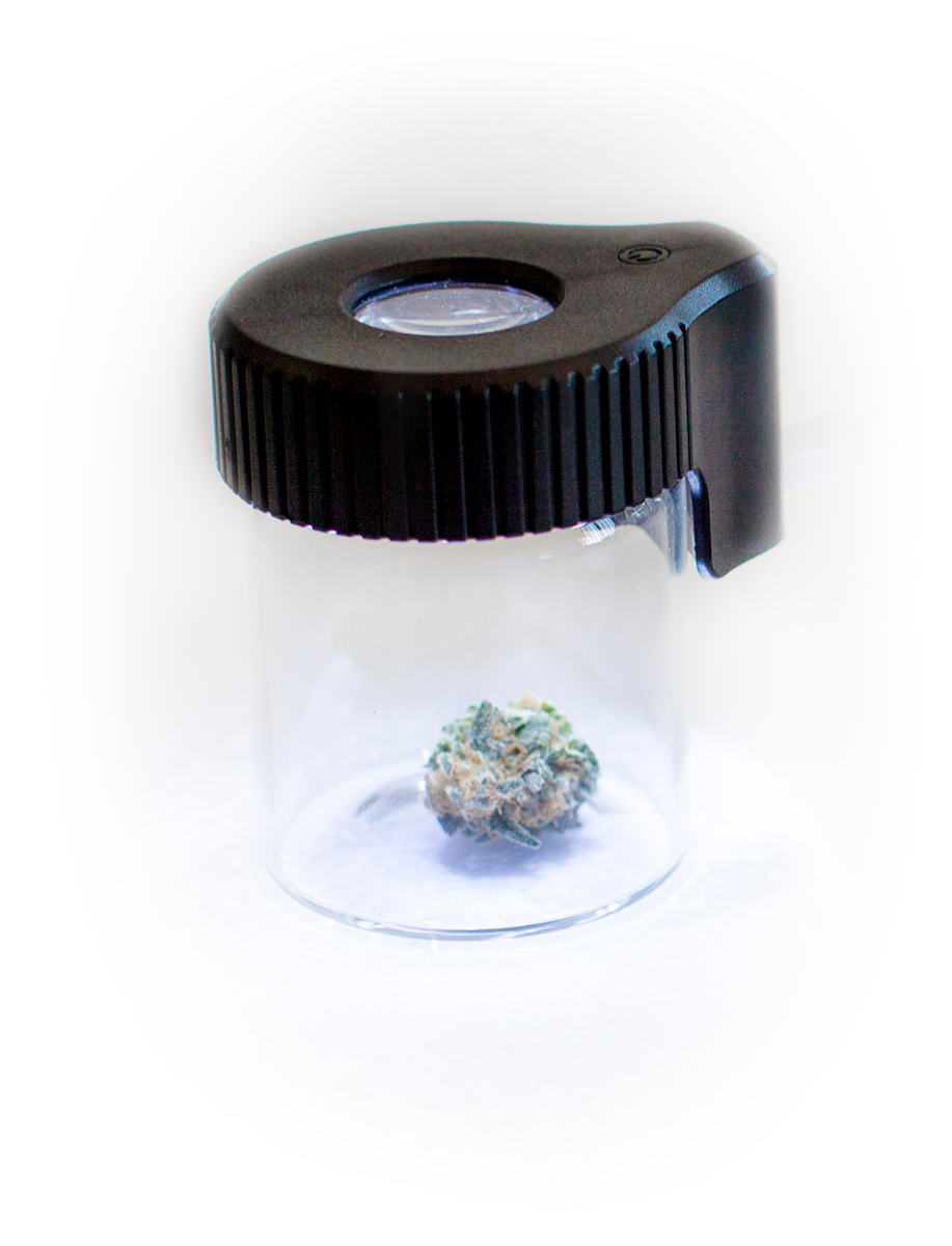 צנצנת זכוכית אטומה לריח מבית PUFFIZ מגיע עם מכסה שהוא גם זכוכית מגדלת עם תאורת לד!, כך ניתן גם בקלות לאחסן ולקבל מבט יותר קרוב על הפרחים שלכם.